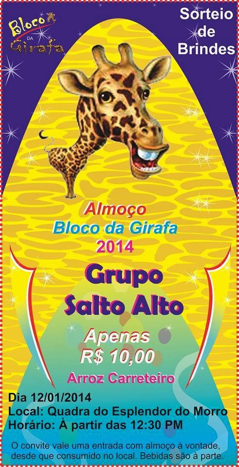 Dia 12/01/2014,domingo, o Bloco da Girafa promove um almoço na Quadra de Ensaios da Escola de Samba Esplendor do Morro,a partir das 12:30 h.O preço do convite é R$ 10,00, sendo que as pessoas podem se servir à vontade.Bebidas à parte. O prato servido será Arroz Carreteiro. Haverá sorteio de brindes.Apresentação do Grupo Salto Alto. É o Bloco da Girafa se preparando para brilhar no carnaval 2014.