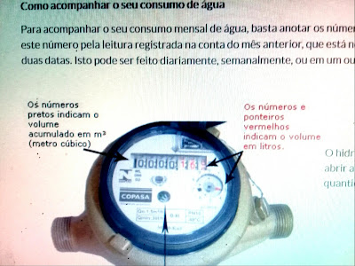 “Para acompanhar o seu consumo de água basta anotar os números registrados no hidrômetro, desprezando o último na cor vermelha. Depois subtraia este número pela leitura registrada na conta do mês anterior, que está no campo “leitura atual”. O resultado significa seu consumo de água no período entre as duas datas. Isto pode ser feito diariamente, semanalmente ou em outra periodicidade de sua preferência.”