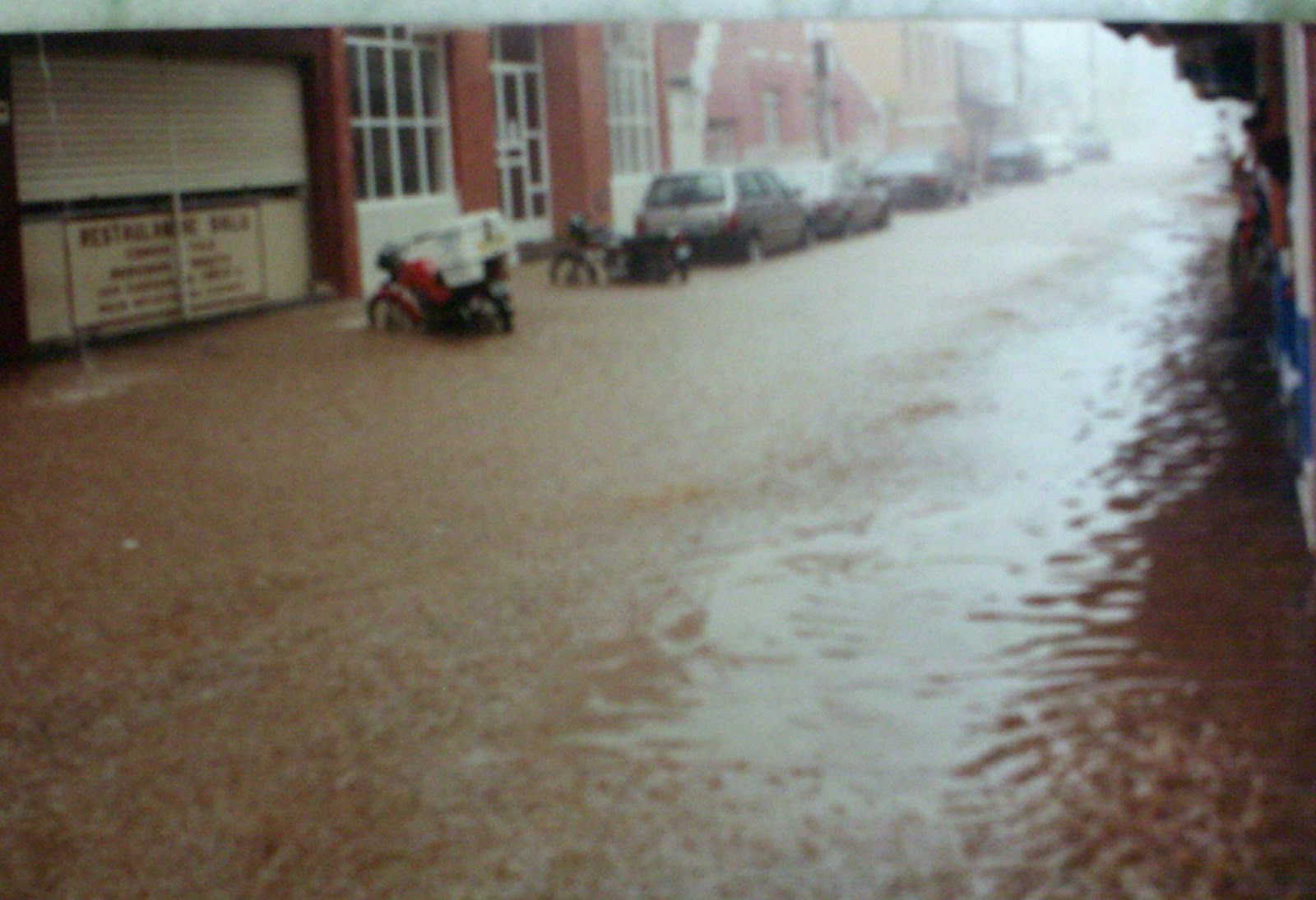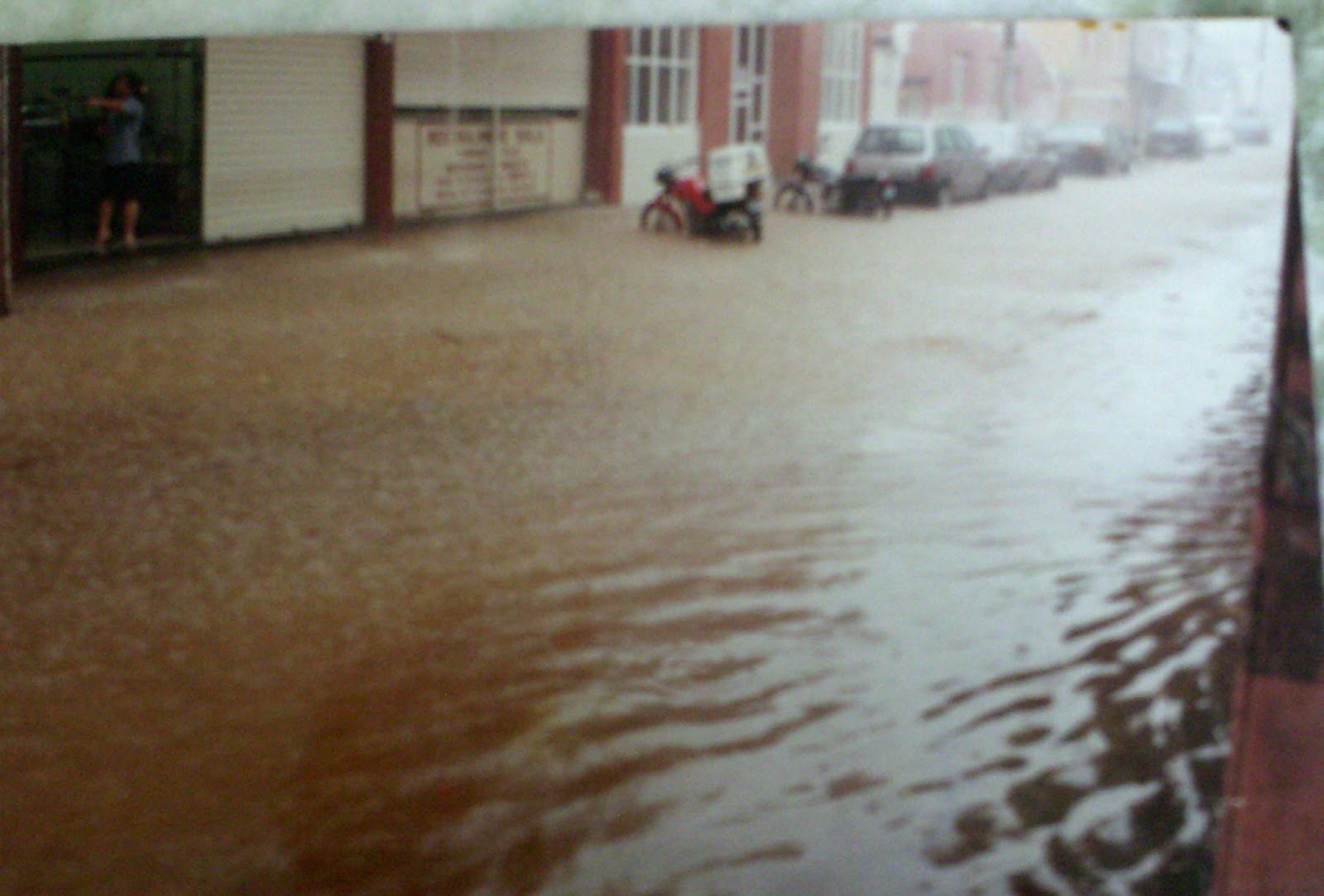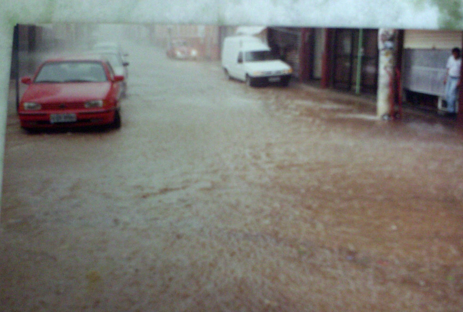 Sim, enchente no calçadão.Fato acontecido durante a administração municipal 89/92, quando o então prefeito Célio Ferraz acabou precisando reformar toda a rede de escoamento de água pluvial sob o piso do calçadão da Rua Cel.José Dutra, a fim de que alagamentos como estes não mais voltassem a acontecer , evitando assim o risco de problemas mais graves.Por esse motivo o calçadão, que não foi construido na administração de Célio Ferraz, precisou ser reformado, e não por vaidade pessoal.Realmente foi um caso de NECESSIDADE, como provam as fotos que aqui exibimos.