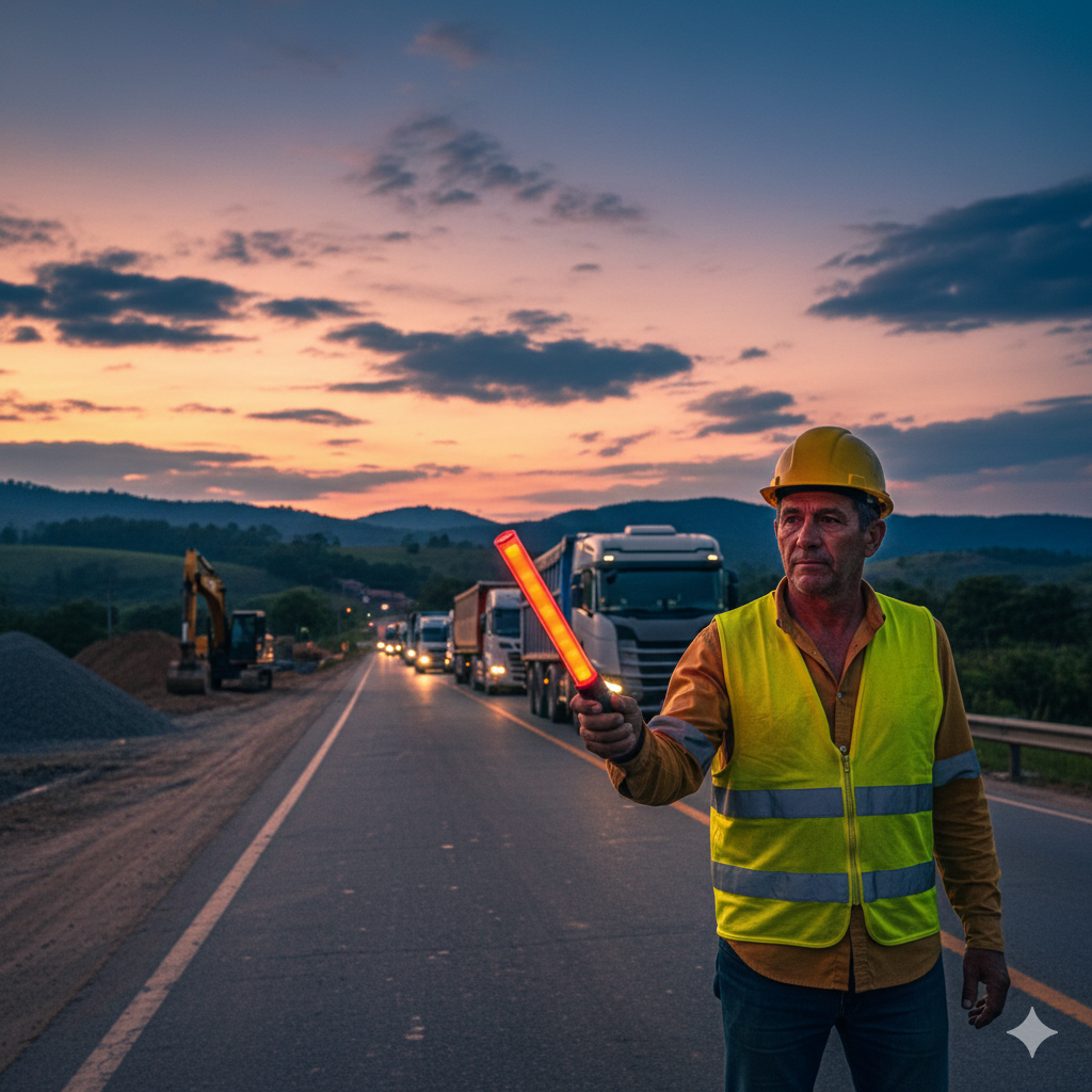 Sugestão de Imagem: 📸 [Uma fotografia capturada no fim de tarde, mostrando um operário de colete refletivo sinalizando o desvio com uma lanterna, enquanto ao fundo vê-se uma fila de caminhões parados e a silhueta das nossas montanhas. A imagem deve transmitir a ideia de pausa necessária e o esforço humano por trás das melhorias na nossa infraestrutura.]