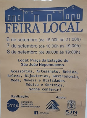 Nos dias 06, 07 e 08 de setembro (sexta, sábado e domingo) após outras edições bem sucedidas, acontece a sensacional Feira Local com a participação apenas de empresas do município, cerca de 70, comercializando, a ótimos preços, mercadorias como acessórios, artesanato, bebida, bijuterias, gastronomia, moda, móveis e utilidades. O evento é organizado pelo Conselho da Mulher Empreendedora de São João Nepomuceno, com o apoio da Associação Comercial e Empresarial e da Prefeitura, por meio da Secretaria Municipal de Desenvolvimento. O local do evento será a Avenida Tancredo Neves e imediações da antiga estação ferroviária (atual Rodoviária).