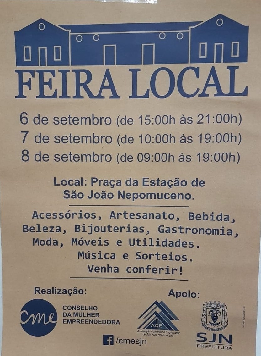 Nos dias 06, 07 e 08 de setembro (sexta, sábado e domingo) após outras edições bem sucedidas, acontece a sensacional Feira Local com a participação apenas de empresas do município, cerca de 70, comercializando, a ótimos preços, mercadorias como acessórios, artesanato, bebida, bijuterias, gastronomia, moda, móveis e utilidades. O evento é organizado pelo Conselho da Mulher Empreendedora de São João Nepomuceno, com o apoio da Associação Comercial e Empresarial e da Prefeitura, por meio da Secretaria Municipal de Desenvolvimento. O local do evento será a Avenida Tancredo Neves e imediações da antiga estação ferroviária (atual Rodoviária).