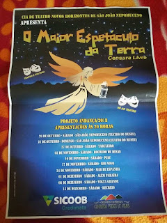 Foram 8 apresentações, em 7 localidades diferentes (devido a alterações no roteiro de cidades e apresentações, por diversos fatores), por todo Estado de Minas Gerais, com a peça de nome: “O Maior Espetáculo da Terra”, com Roteiro e Direção de Ney Morais. Foram duas apresentações em São João Nepomuceno – MG e depois uma em cada cidade diferente, por final de semana. A peça, de aproximadamente 90 minutos, tem classificação indicativa livre, e é permitida para todos os públicos.
